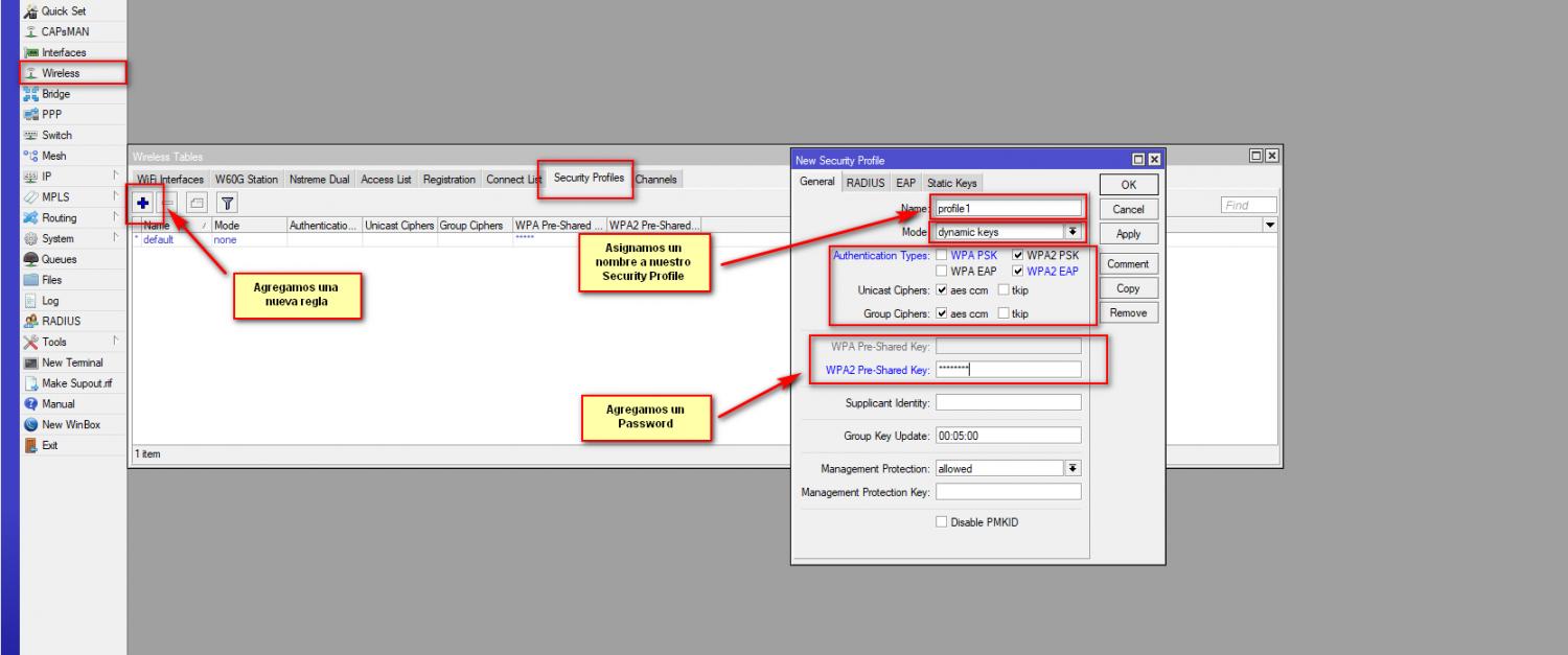 3 Nos dirigimos al apartado de “Wireless” en donde agregaremos un Security Profiles, el cual servirá para el password de nuestra WLAN.