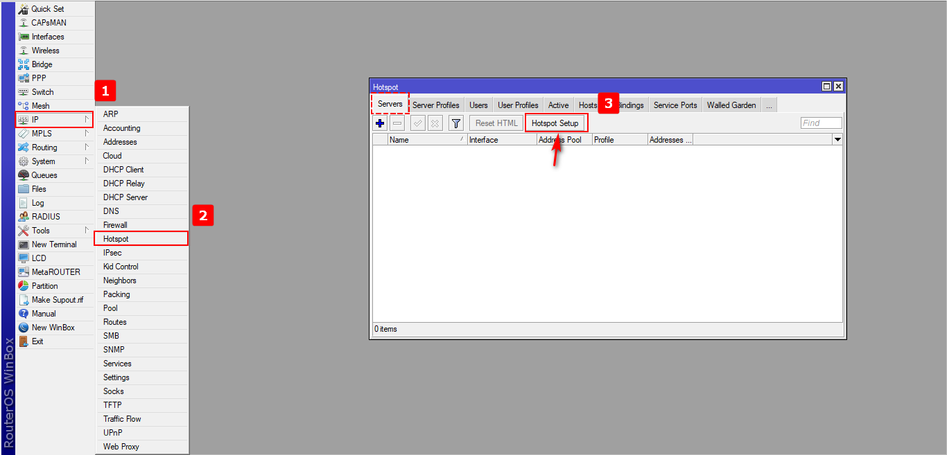 1 Nos dirigimos a al aparatado de IP/Hotspot donde encontramos la opción de Hotspot Setup la cual nos permite crear un server hotspot con las configuraciones necesarias para poder trabajar.