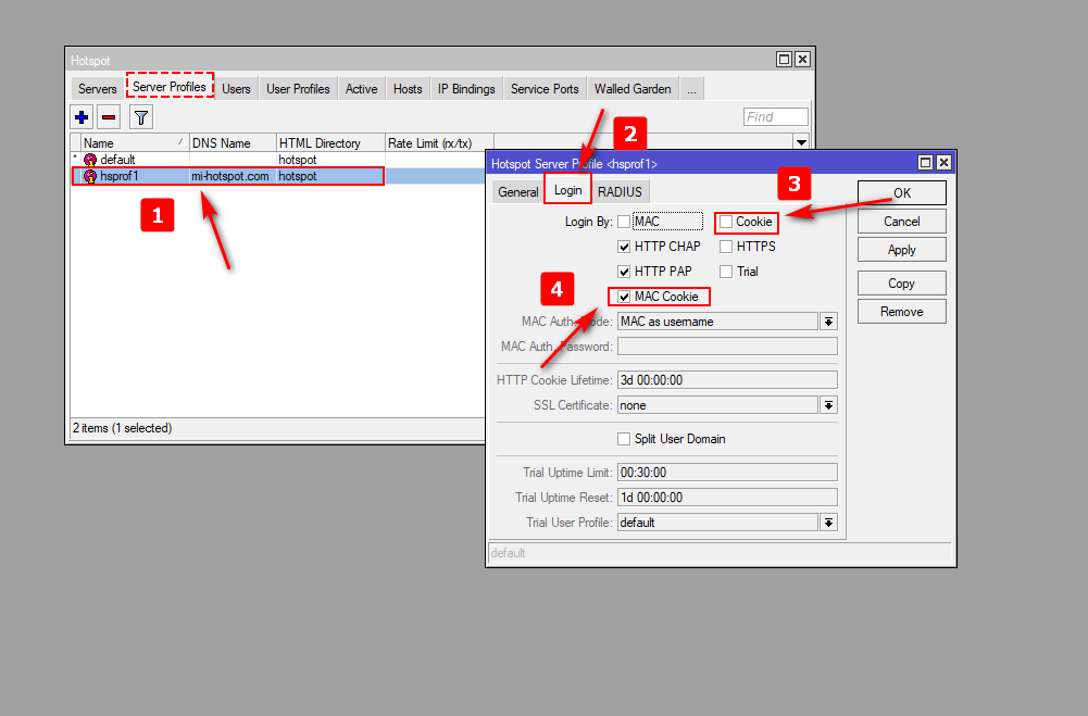 Activaremos la función de MAC coockies para que así el servidor Hotspot solo almacene una dirección mac y si hay más de un host con la misma dirección MAC, el usuario no iniciará sesión y se eliminará el registro de cookies MAC para esta dirección. También debemos desactivar la Cookie para que no lo limite por el tiempo de HTTP Cookie Lifetime y cree conflictos con el tiempo asignado en Mac Cookie el cual se define en el User Profiel.
