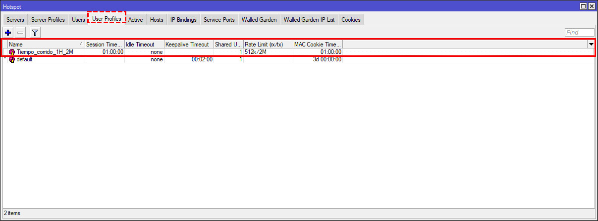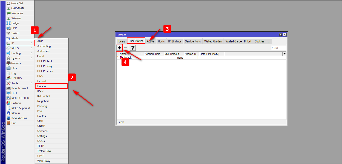 1 Nos dirigimos a IP/Hotspot y buscamos la pestaña de User Profile, aquí le damos al botón con el símbolo de +.