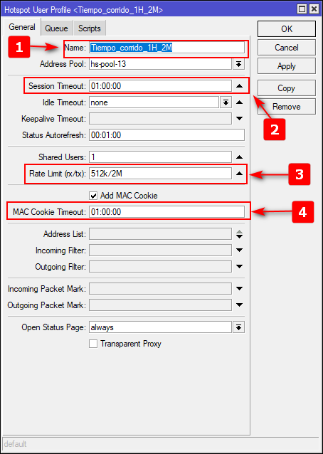 - Idele Timeout: período de inactividad para clientes no autorizados. Cuando no hay tráfico desde este cliente (literalmente, la computadora del cliente debe estar apagada), una vez que se alcanza el tiempo de espera, el usuario se elimina de la lista de host de HotSpot, su dirección utilizada está disponible