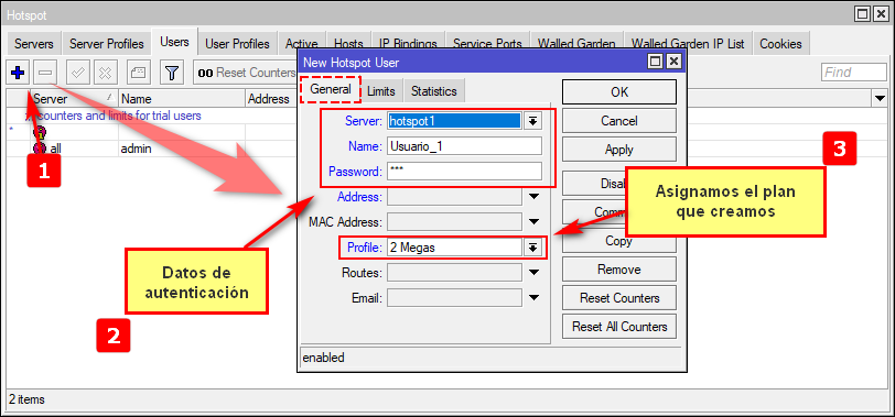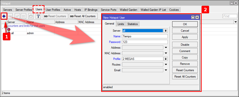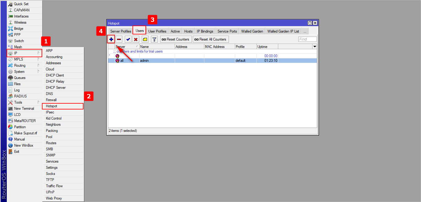 1 Nos dirigimos al apartado de IP/Hotspot y una vez aquí nos dirigimos a la pestaña de Users. Ya estando aquí le daremos al signo de + el cual nos abrirá los ajustes generales para crear un usuario.