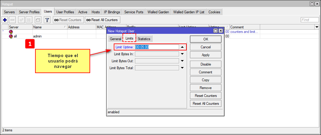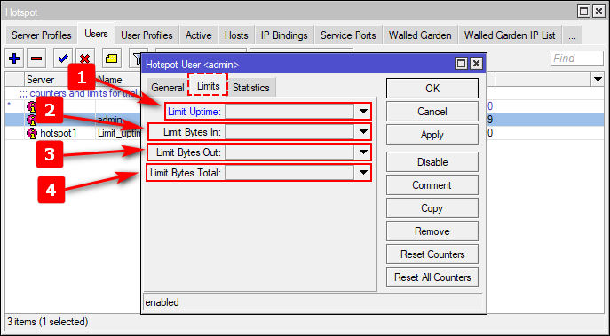 En Mikrotik podemos definir por medio de los limits cuanto tiempo o consumo de datos puede consumir el usuario antes de ser cortado. En este apartado mostraremos 3 opciones para limitar el usuario.