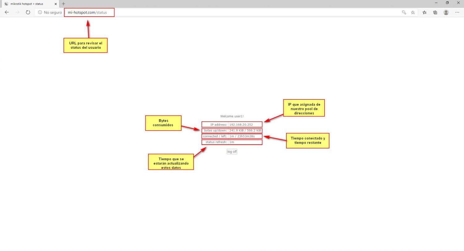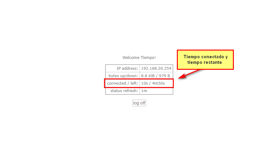 Ingresaremos con el usuario que acabamos de crear y verificamos que nos marque el tiempo de conexión y el tiempo en el cual será desconectado que en este caso será de 5 minutos.