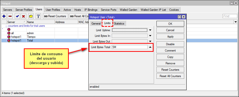Para limitar el consumo de un usuario debemos asignar en Limit Bytes Total la cantidad de bytes que podrán ser consumido, pasando este consumo el usuario no podrá seguir navegando.Para este ejemplo limitaremos un consumo maximo de 5 megas.