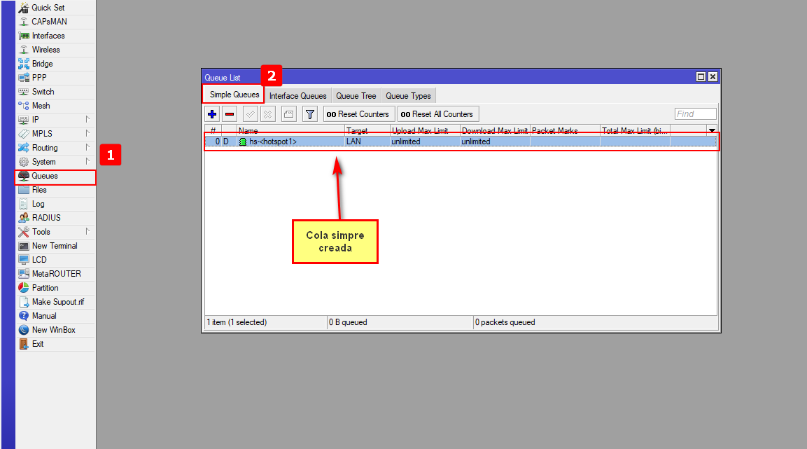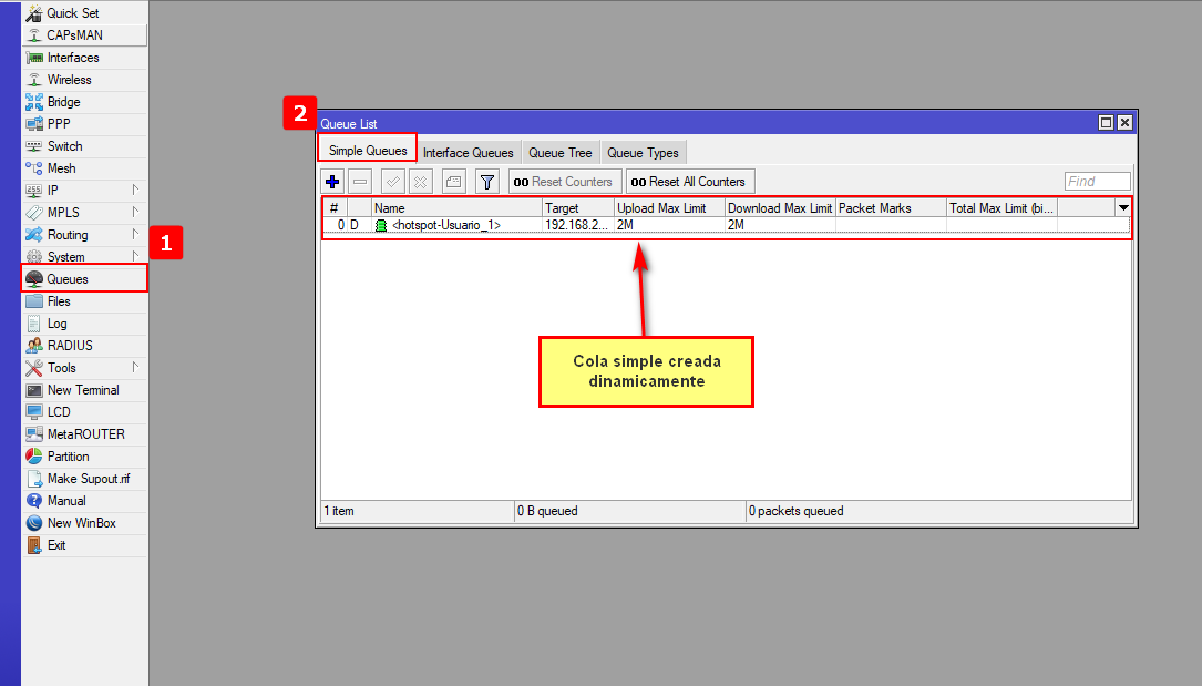 Una vez creado el usuario cuando inicie sesión se creara una cola simple con la velocidad asignada en el profile