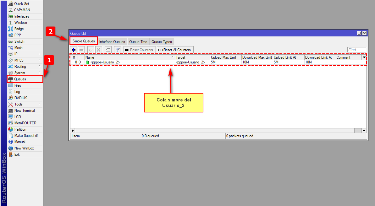 Si el usuario está siendo limitado desde un profile se nos creara una cola simple en Queues/Simple Queues