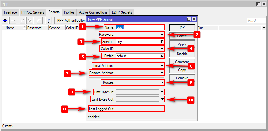 Nos dirigimos a las configuraciones de PPP y nos colocamos en la pestaña de secrets (PPP/Secrets) en donde le daremos en el botón con el símbolo de + lo que nos abrirá un nuevo panel de configuraciones, aquí asignamos los datos de autenticación y algunas otras configuraciones.