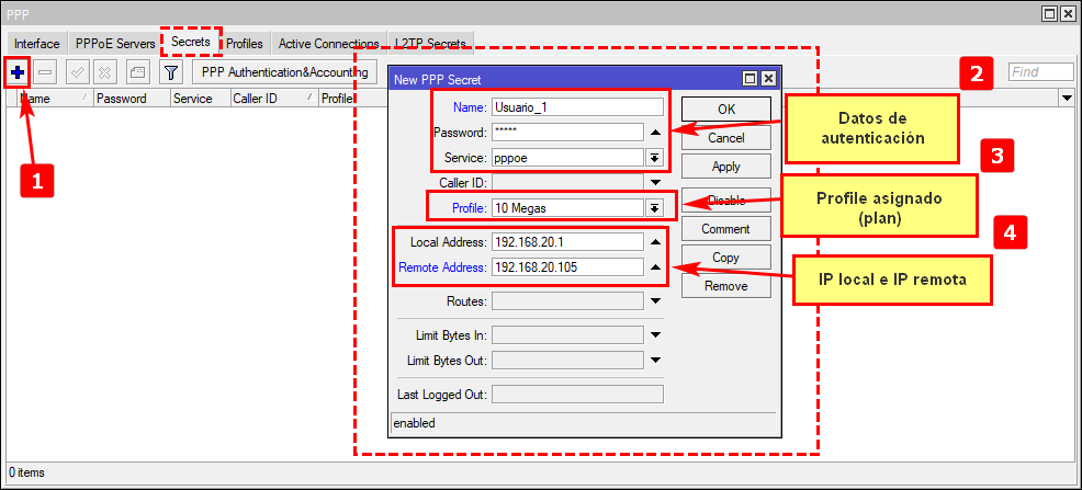 Un secret es un usuario donde se registran los datos de acceso para conexiones PPP que en nuestro caso lo crearemos para una conexión PPPoE. Los usuarios que creamos serán almacenados en la base de datos del Rb.
