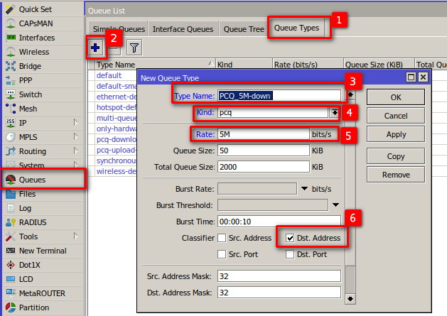 add kind=pcq name=PCQ_5M-down pcq-classifier=dst-address pcq-rate=5M
