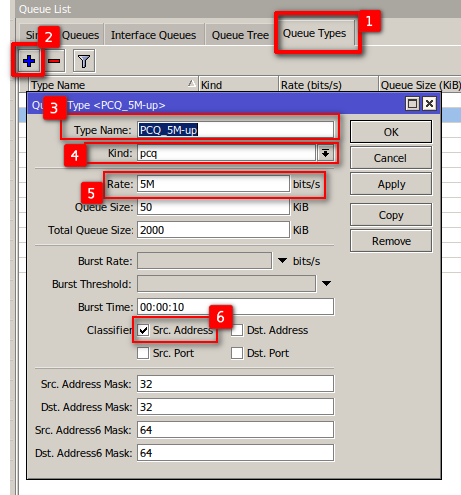 add kind=pcq name=PCQ_5M-up pcq-classifier=src-address pcq-rate=5M