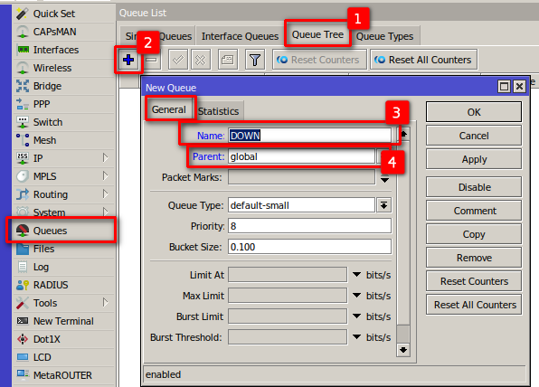 Estos pasos 3.1 y 3.2 donde creamos los queues Down, Up solo se crean una vez. En caso de configurar otro plan diferente omitimos estos pasos.