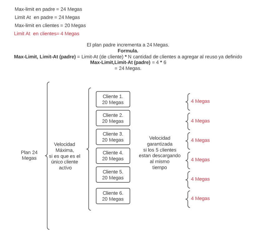 max-limit,limit-at ( en padre) = limit-at (del hijo) * N cantidad de clientes a agregar.