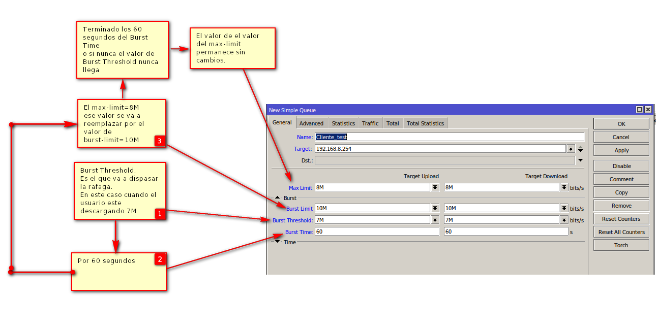 El mecanismo de ráfaga es simple: si se permite ráfaga, el valor del max-limit se reemplaza por el valor del burst-limit esto cuando cuando lleguemos a un valor establecido en burst-threshold todo esto va a ocurrir por un periodo de tiempo en segundos definido burst-time.