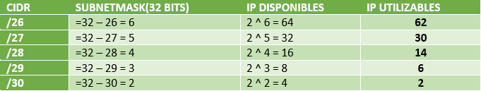 Número de IPs es 26 = 64 direcciones IP, de las cuales 62 pueden ser asignadas a máquinas. La dirección de sólo 0's y sólo 1's están reservadas. Solo 1's es la de broadcast.