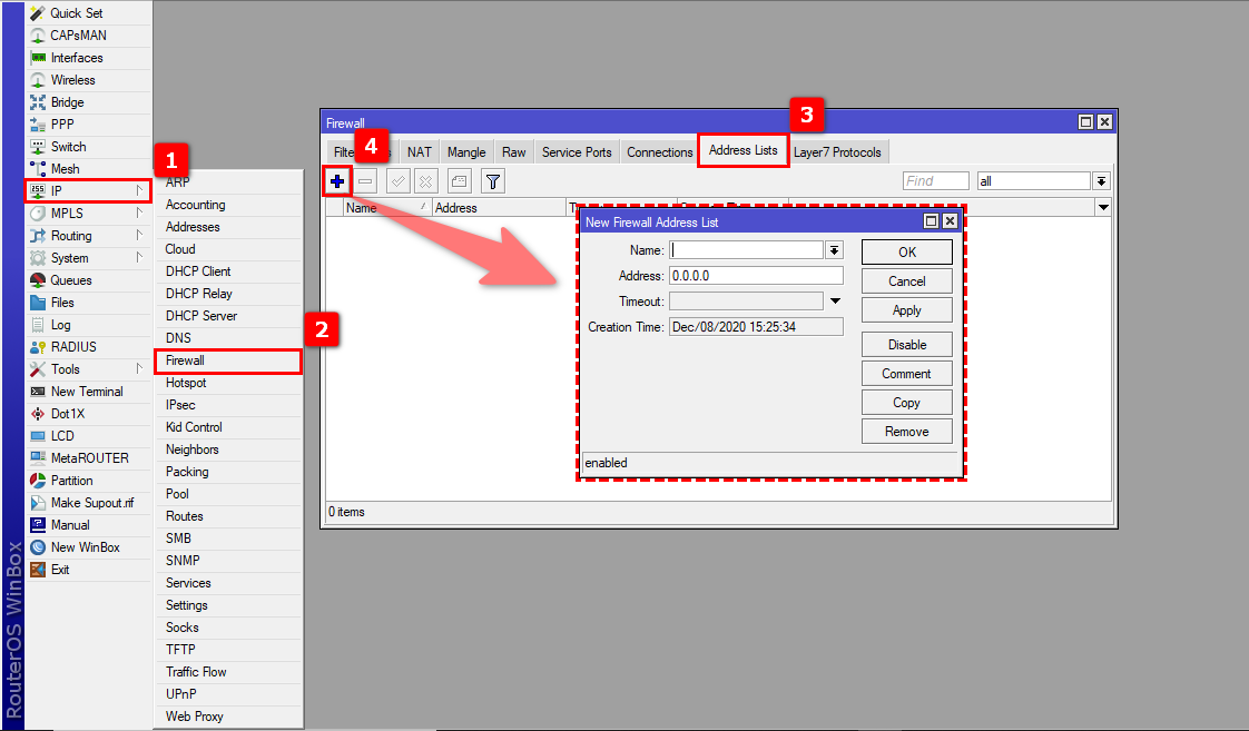 1Nos dirigimos a IP->Firewall->Address List donde agregaremos las listas que vamos a utilizar.