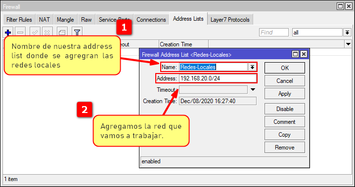 2Creamos una address list con el nombre Redes-Locales y agregamos nuestras redes LAN.