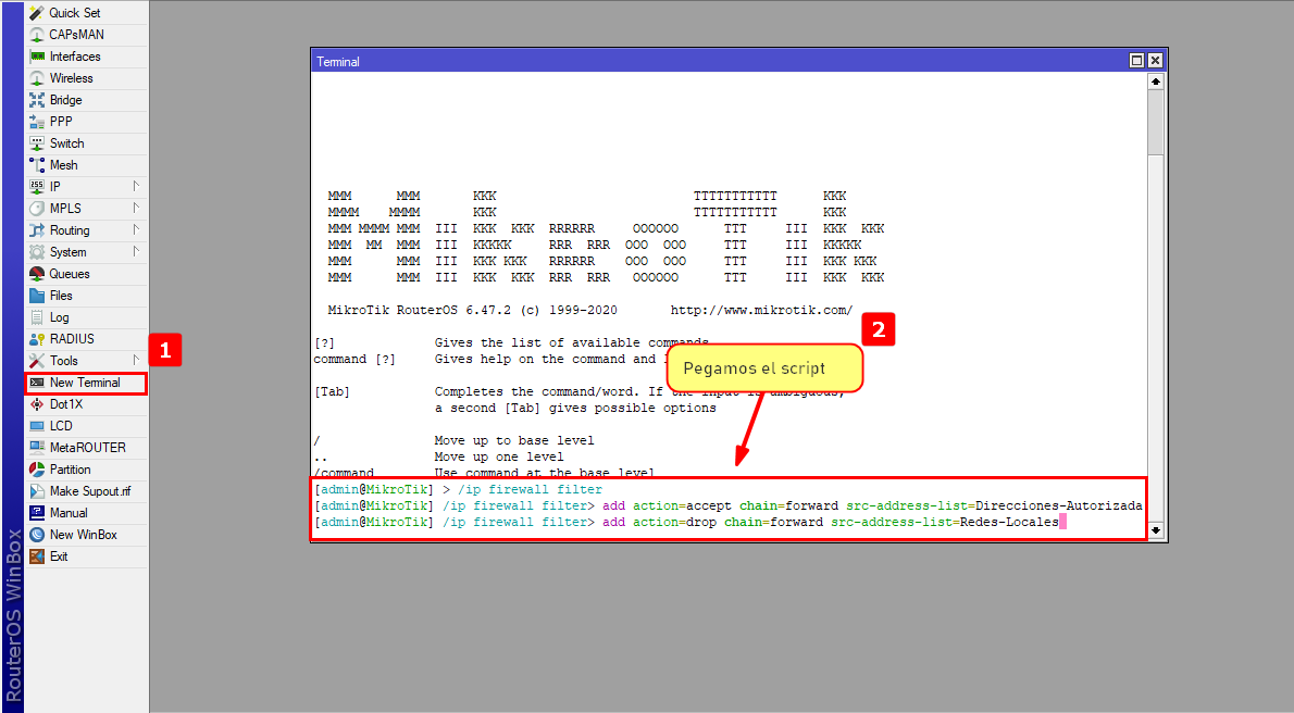 4Una vez que tengamos las dos listas vamos a pegar el siguiente script en la terminal de nuestro equipo lo que nos creara dos reglas, una que permite que las direcciones IP puedan navegar y otra que deniega todo el tráfico que este en la red LAN.