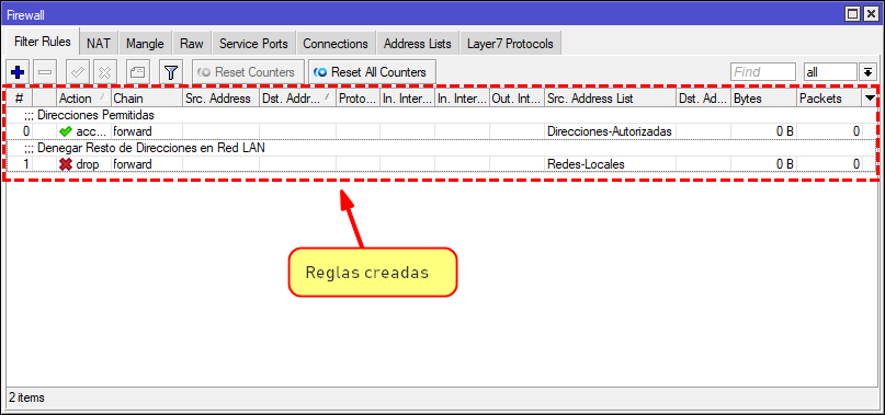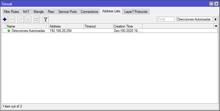 Con esto ya estamos seguros de que solo las IP que están en nuestra address list de Direcciones Autorizadas y que cualquier otra dirección que este dentro del segmento de la red LAN que agregamos en la address list de Redes-Locales no podrá navegar.