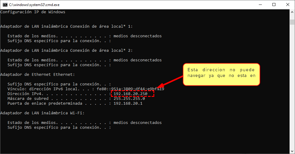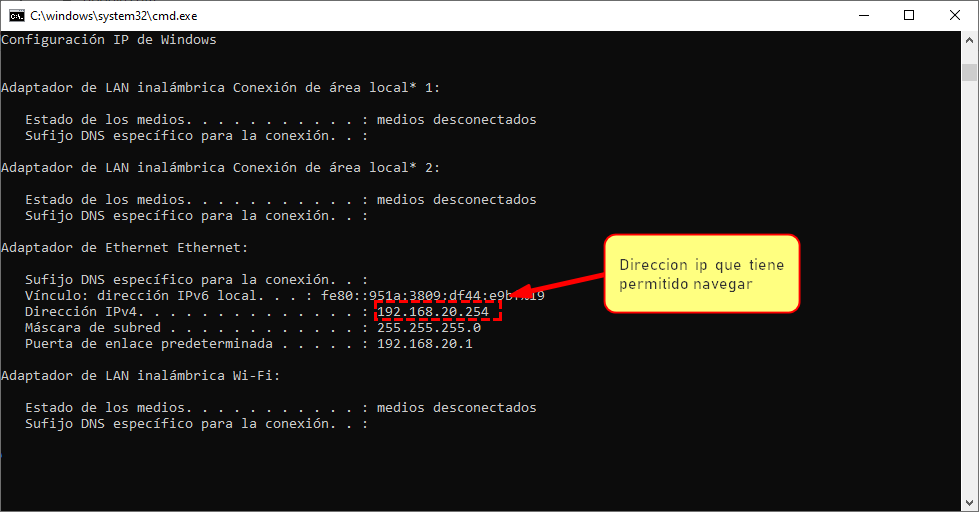 Ahora si probamos con la IP 192.168.20.254 la cual si esta agregada como una dirección autorizada veremos que si podemos navegar.
