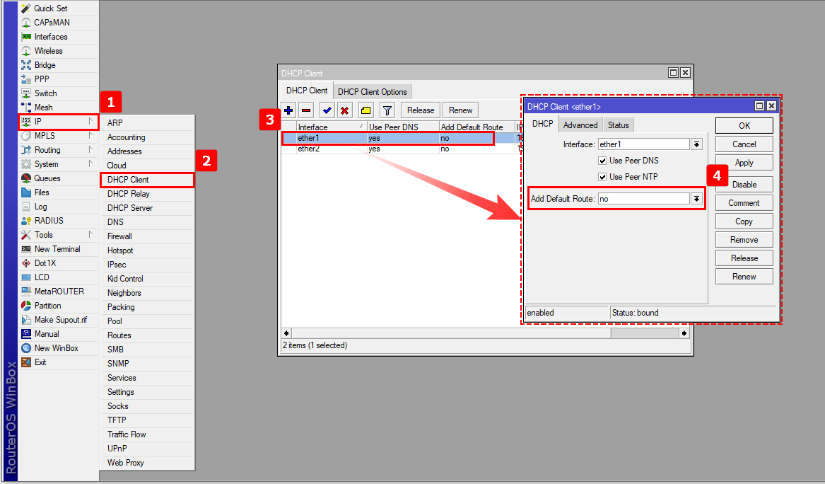 Si está asignado el direccionamiento IP por DHCP en los puertos de su WAN, debe de desactivar que se creen una ruta por defecto.