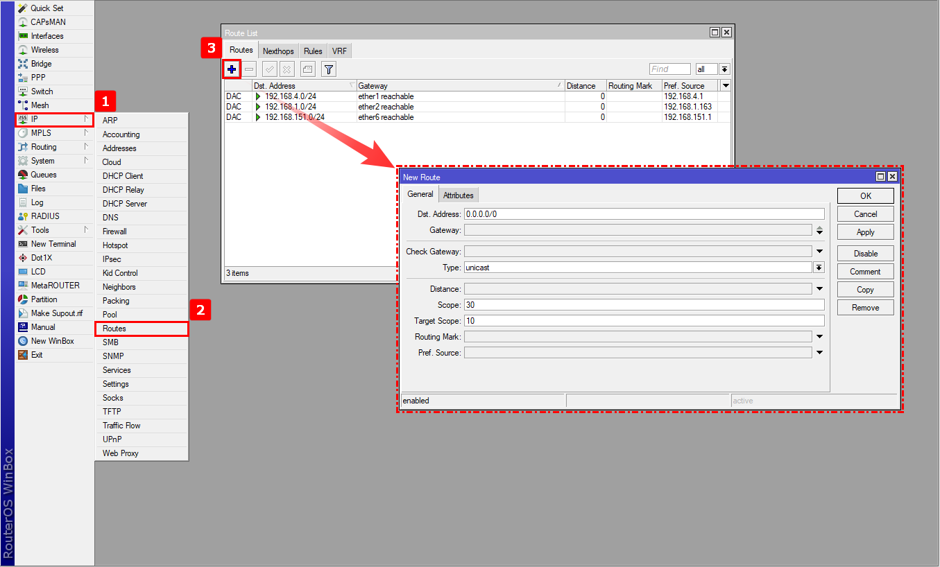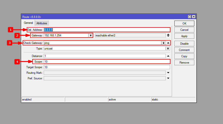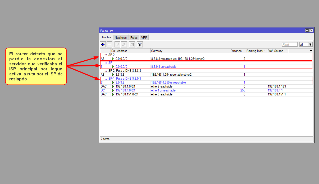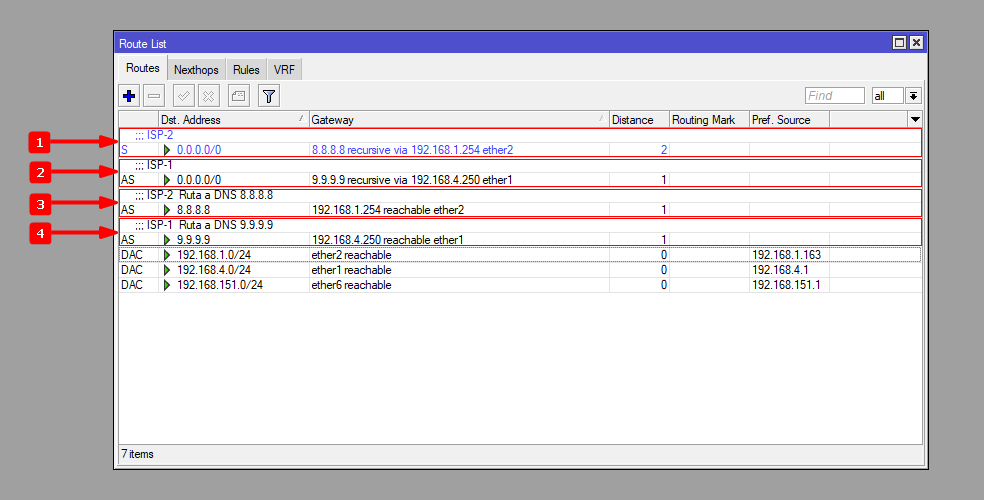 4Verificar que se hayan configurado todas las rutas correctamente. Debemos de tener activa ambas rutas que verifican los servidores externos por nuestros ISP. También una de las rutas por defecto debe estar activa y de marcar como ruta recursive, que es la ruta que principal (distancia administrativa1). La segunda ruta por defecto es la que saldrá por nuestro ISP de respaldo y debe estar desactivada.