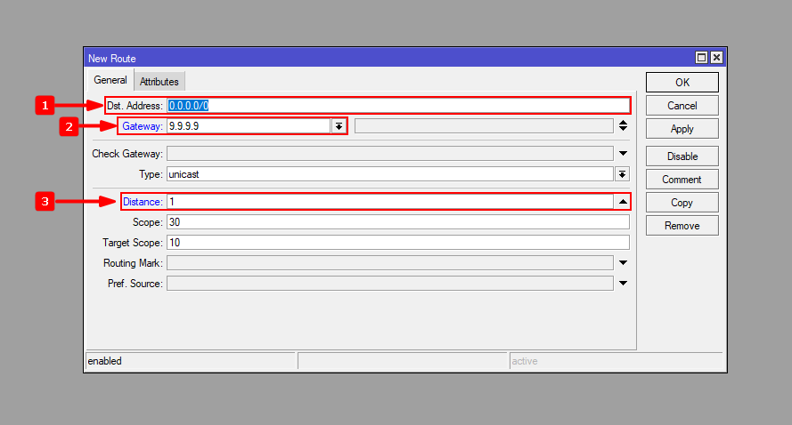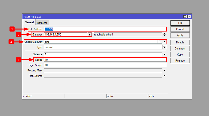 2Primero debemos de crear dos rutas estáticas a dos servidores externos a nuestra red por medio de los Gateway y poder monitorearlos. La primera ruta que crearemos será al servidor de Quad9 (9.9.9.9) de IBM y la segunda al servidor DNS de Google (8.8.8.8). En cada ruta se debe de configurar el Scope en 10 y activar el Check Gateway en modo ping.