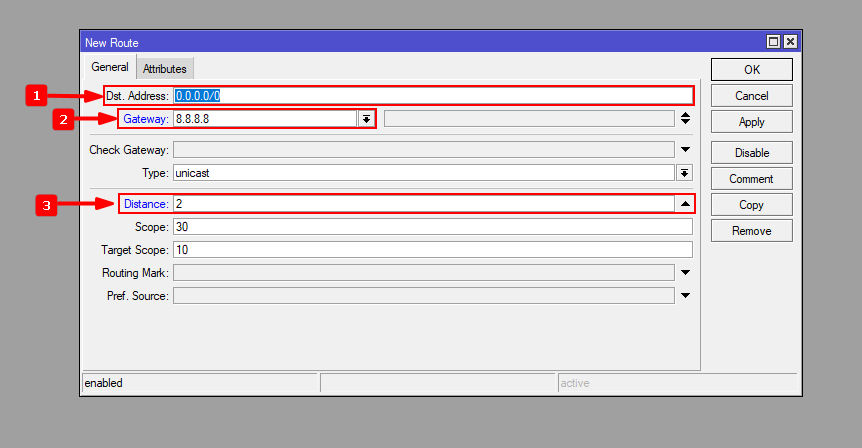 3Una vez que creamos las rutas para monitorear los servidores externos vamos a crear las dos rutas por defecto con cada uno de los proveedores, pero en este caso, en vez de utilizar el Gateway de nuestro ISP vamos a utilizar cada uno de los servidores que estamos monitoreando. A cada ruta se le debe asignar la Distance dependiendo de quién sea la línea principal (La ruta con la distancia más corta será la que tomara la prioridad)