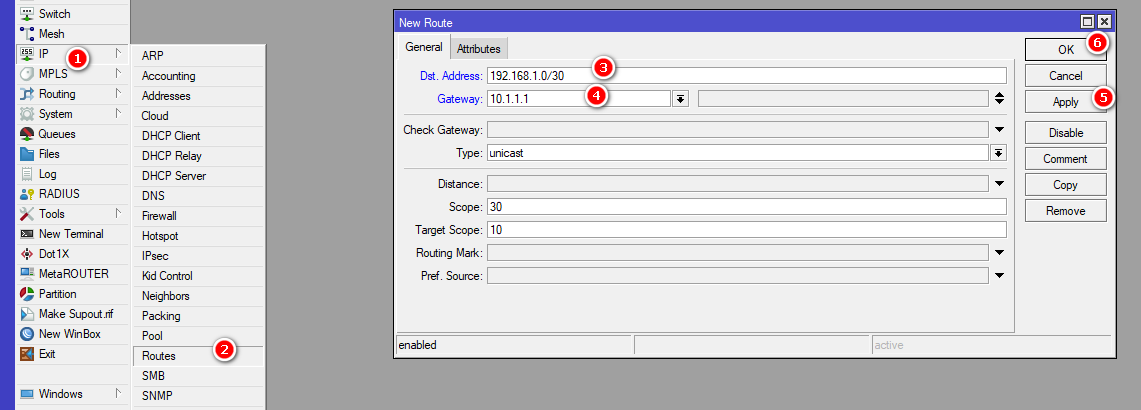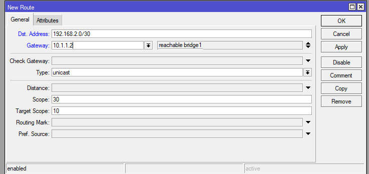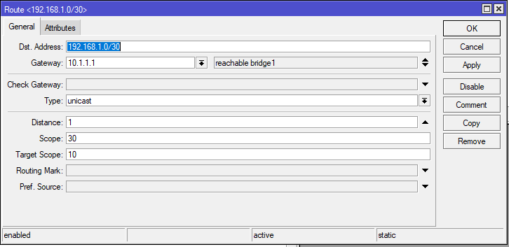 /ip route add dst-address=192.168.1.0/30 gateway=10.1.1.1