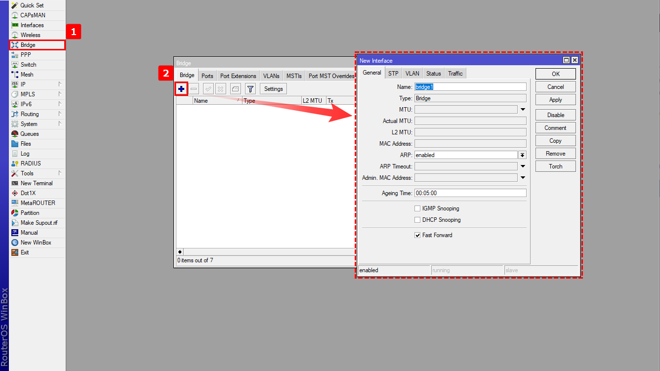 1Creamos un Bridge para poder agregar los puertos WAN y LAN.