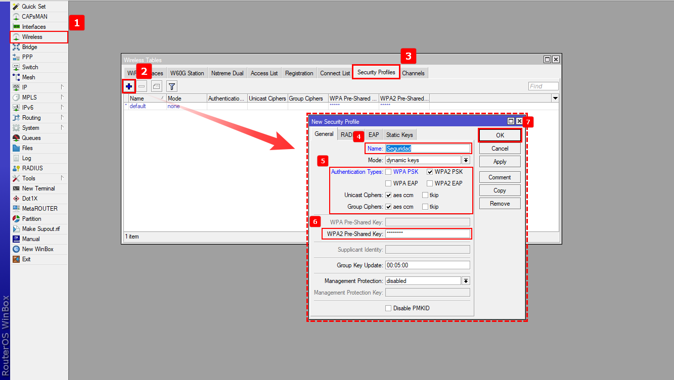 4Una vez que se nos asigno una IP vamos a pasar a las configuraciones para el puerto wlan al cual se conectaran los dispositivos vía WIFI. Primero crearemos el perfil de seguridad para la autenticación de los host.