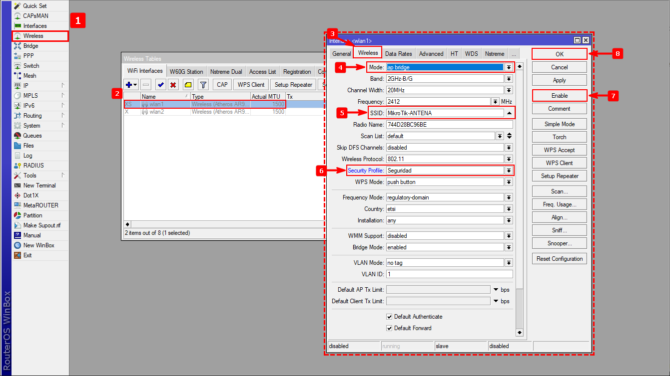5 Una vez que tengamos el perfil de seguridad creado pasaremos a configurar el puerto wlan que usaremos que en mi caso es el puerto wlan1. Aquí configuraremos el puerto en modo ap bridge.