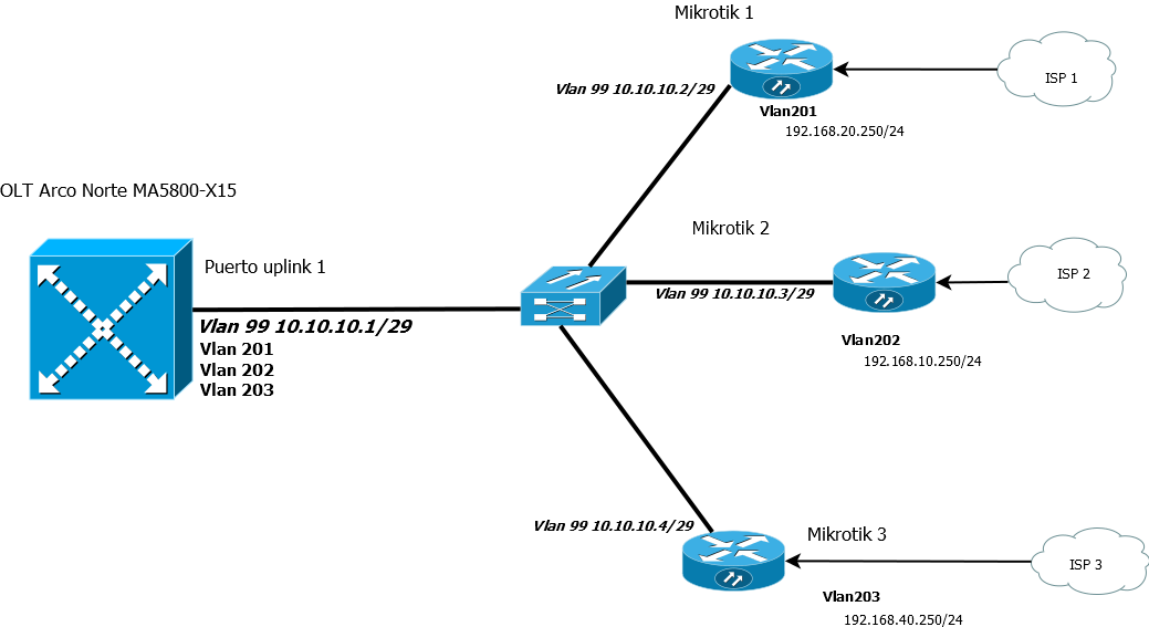 - Se conectará 3 RB Mikrotik a la OLT por medio de un puerto UPLink 10G, esto para aprovechar la capacidad(10G) del puerto