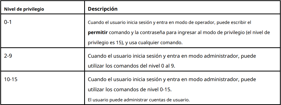 La gestión de usuarios define 16 niveles de privilegios (0 - 15). Tabla describe los privilegios del usuario.