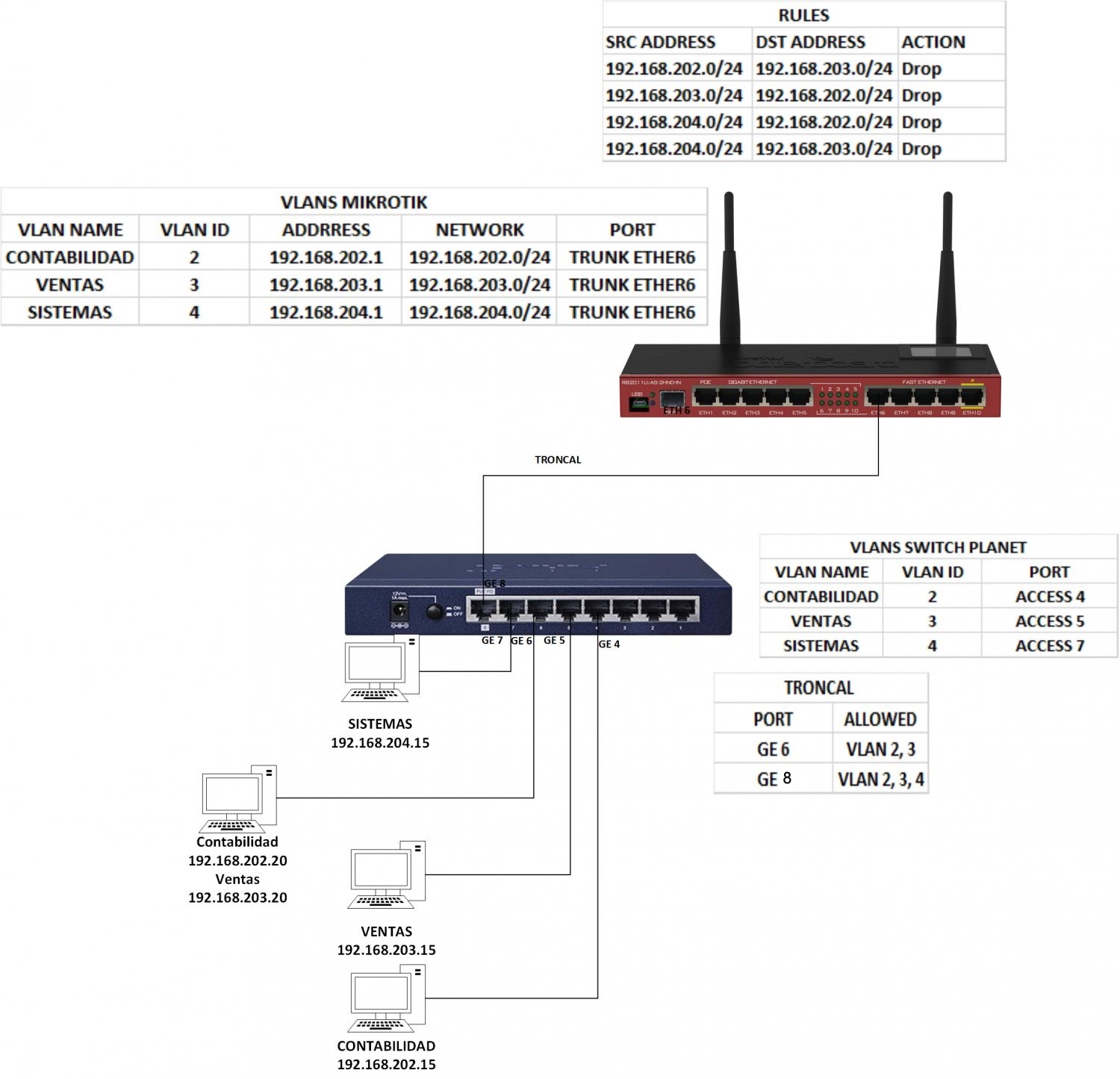 Estas Vlans serán configuradas en el RB como en el Switch Planet