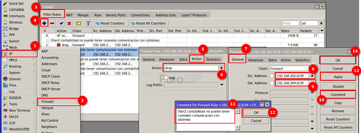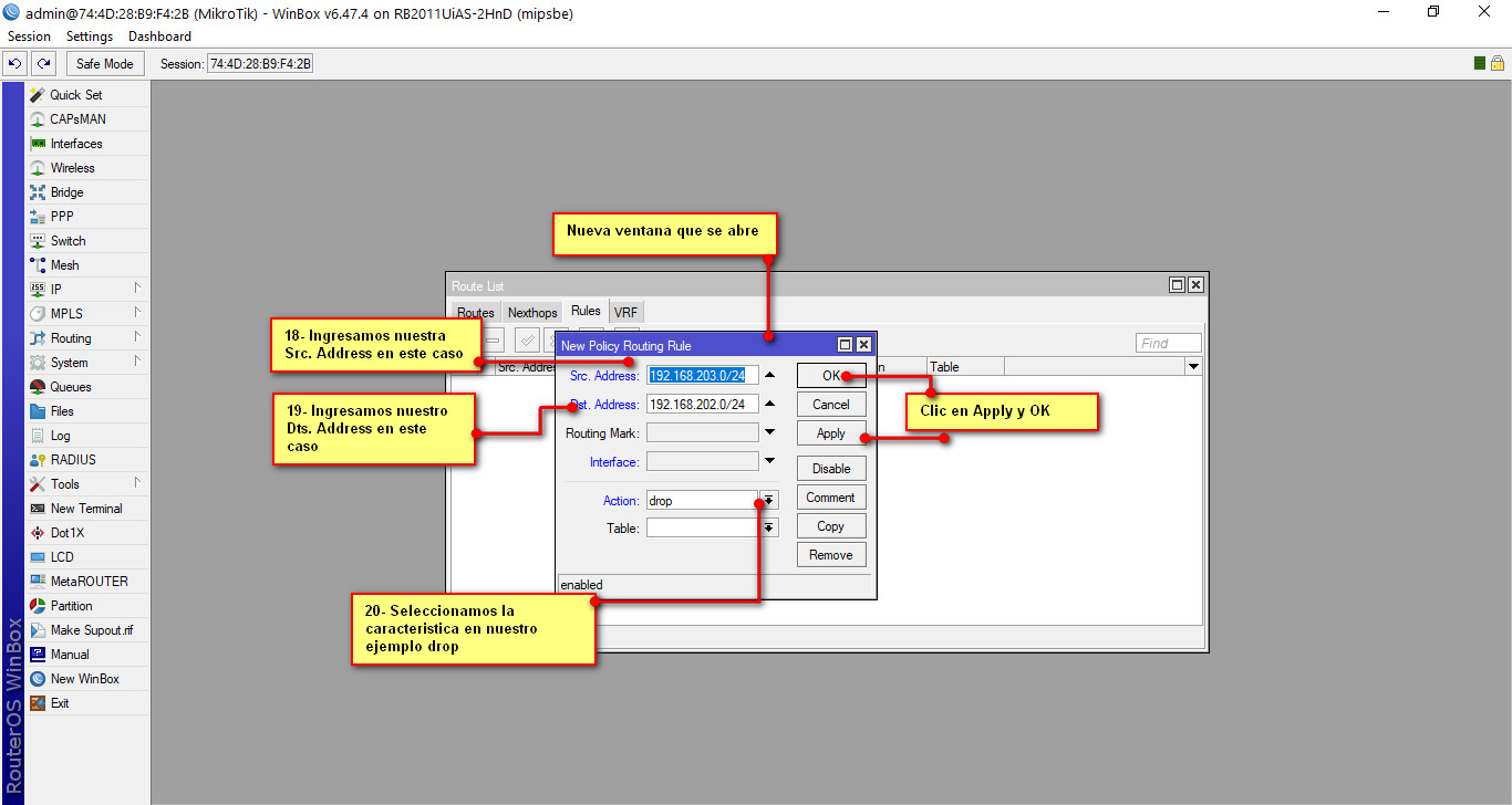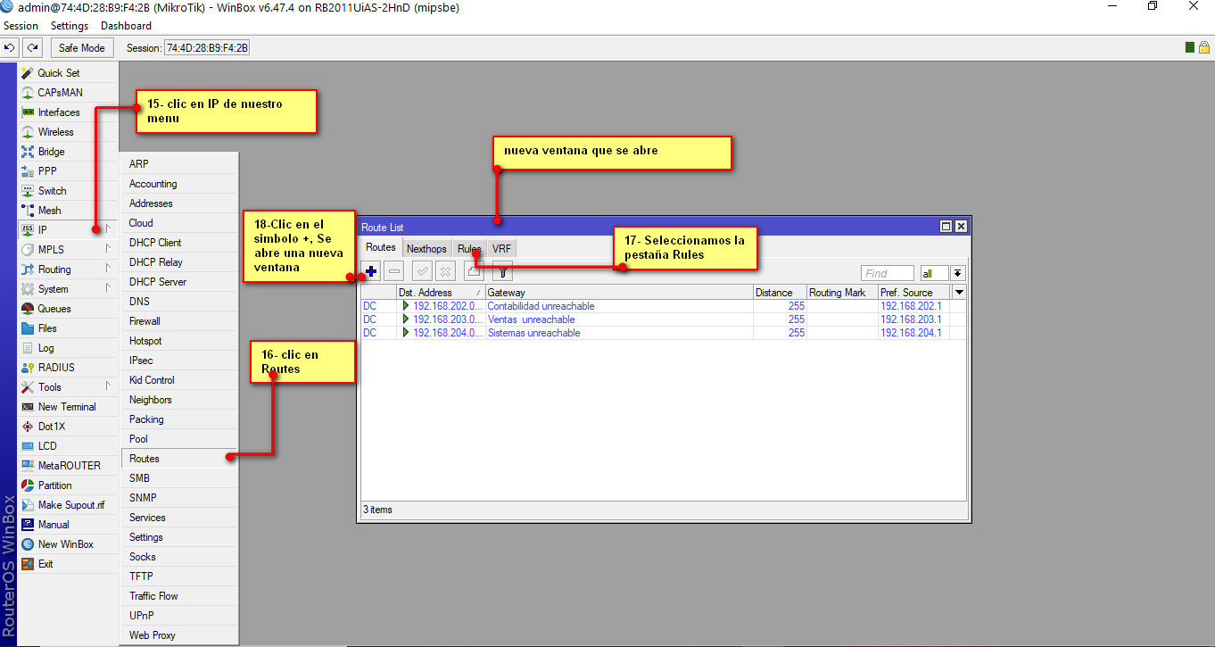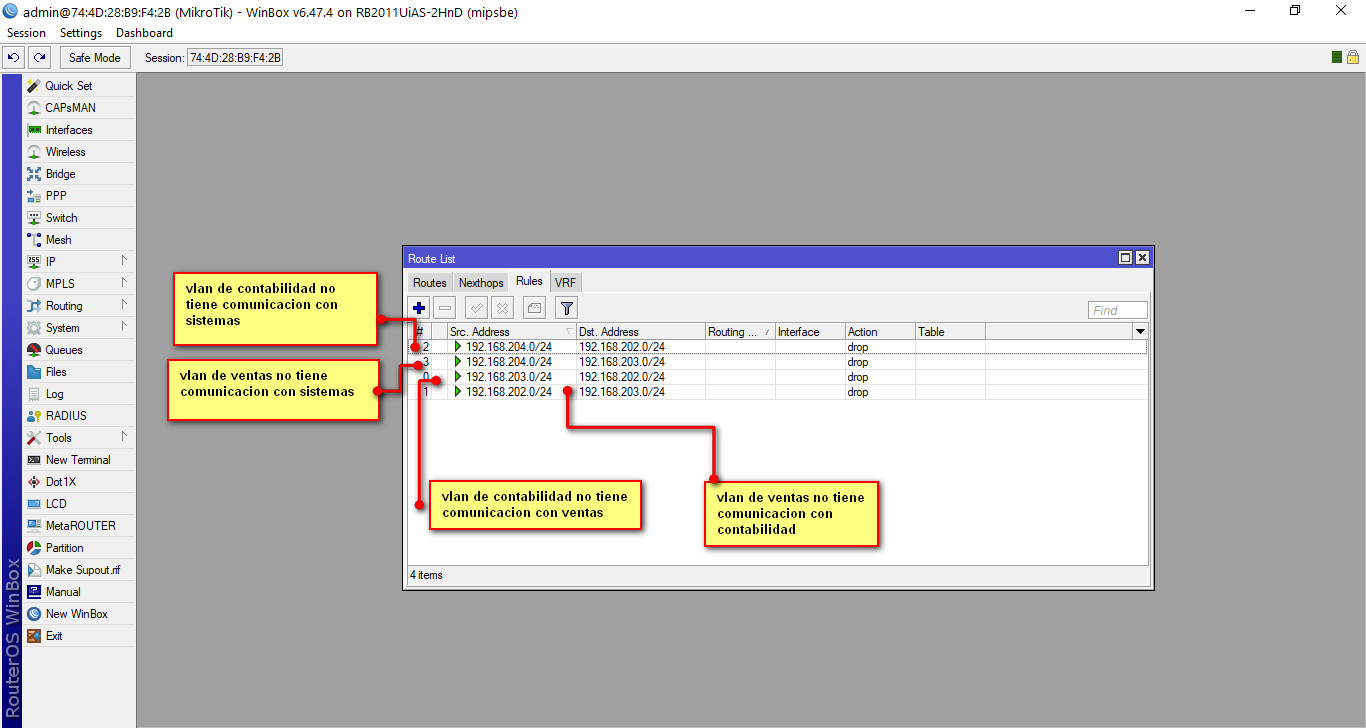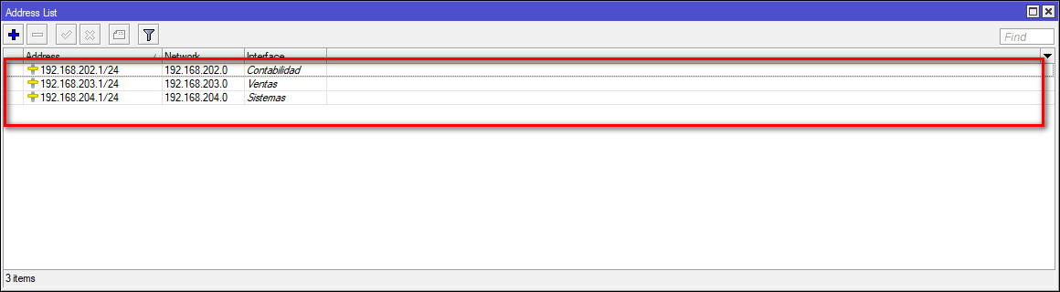 Miktrotik por default trae que nuestras direcciones VLANS que creamos puedan tener comunicación entre ellos, como parte de privacidad y seguridad bloquearemos la comunicación entre estas Vlans para ello en el menú del RB seleccionamos /IP---Addresses, seguidamente nos aparecerá una nueva ventana, como podremos observar esta ventana tiene unas direcciones ya configuradas que aprendió el RB de manera dinámica. Esta nueva ventana que se abre tiene varias pestañas, seleccionamos la pestaña RULES seguidamente clic en el símbolo de + y se nos abrirá una nueva venta