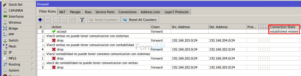 -La Vlan de Contabilidad y Ventas no podrán tener comunicación entre si ni tampoco podrán tener comunicación con la Vlan de Sistemas