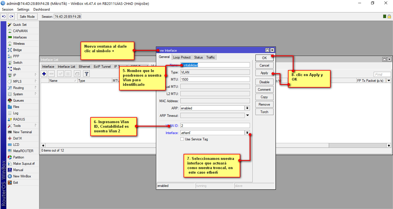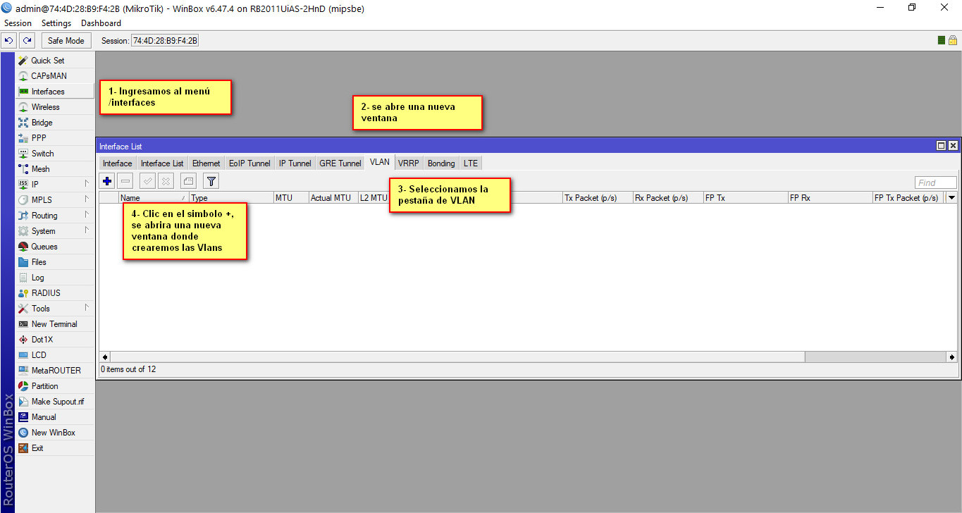 En el menú de nuestro RB se encuentra el botón Interfaces, le damos clic y se abrirá una nueva ventana, esta ventana tiene varias pestañas, seleccionamos la pestaña VLAN. Se muestra la interface de VLAN y nos aparece un símbolo de +, damos clic en este símbolo y se abrirá una ventana nueva donde crearemos nuestras interfaces lógicas Vlans