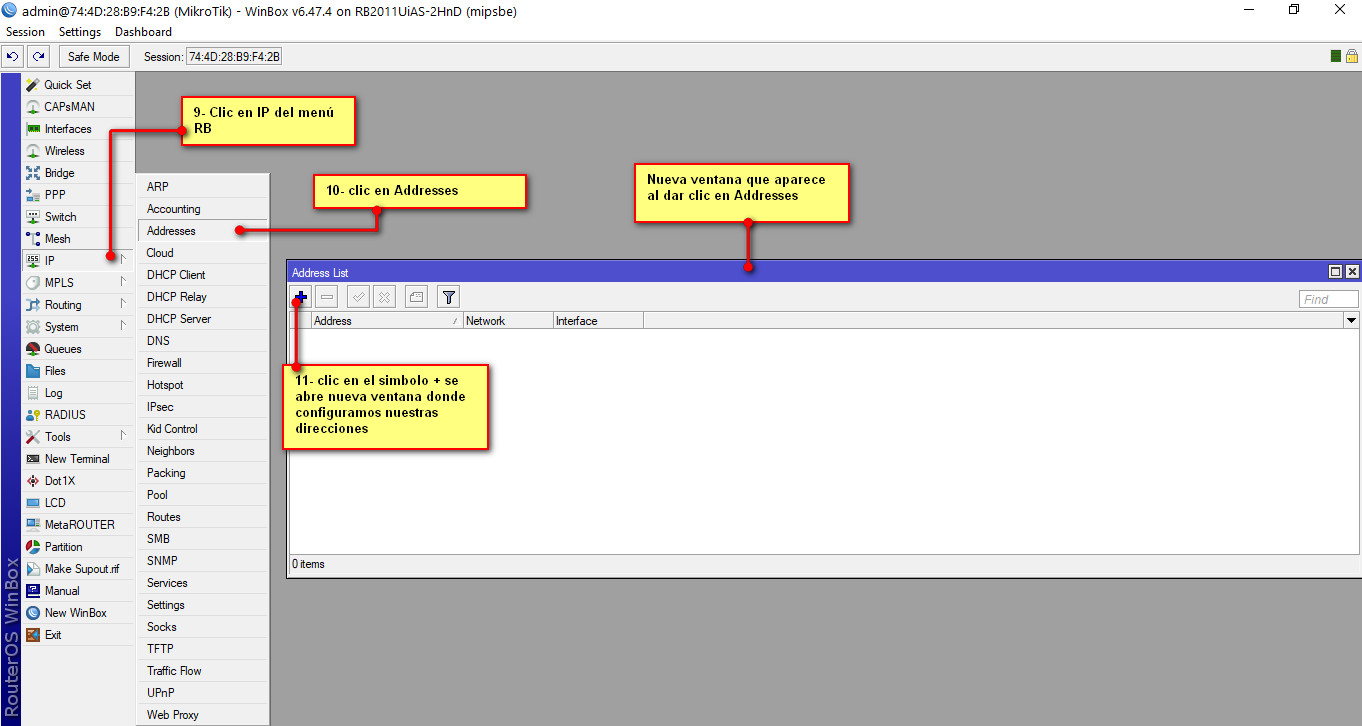 Como siguiente paso es darle dirección a nuestras Vlans, para eso vamos al menú del RB seleccionamos /IP-Addresses nos aparece una nueva ventana, seleccionamos el símbolo + , se abrirá una nueva ventana donde configuramos nuestras direcciones
