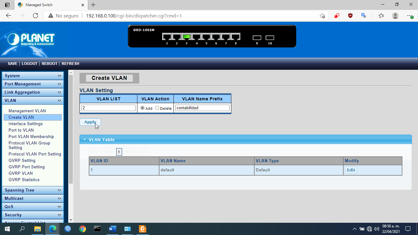 CONFIGURACION DE VLAN EN SWITCH PLANET MEDIANTE INTERFAZ GRAFICA