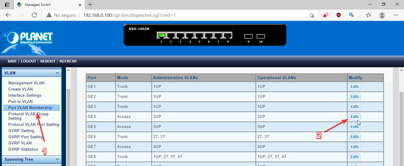 En este switch GSD-1002M vamos a configurar las siguientes VLAN