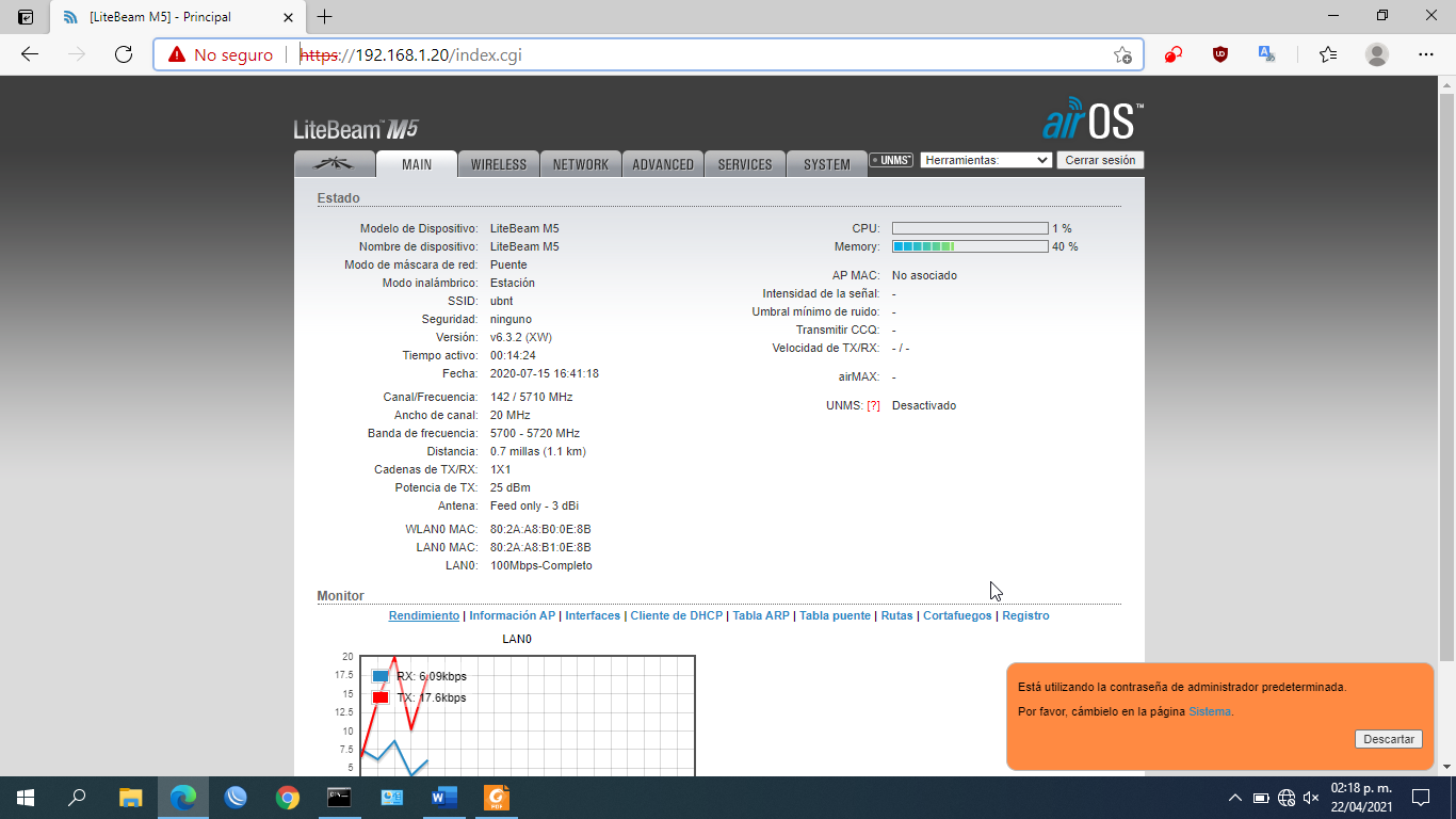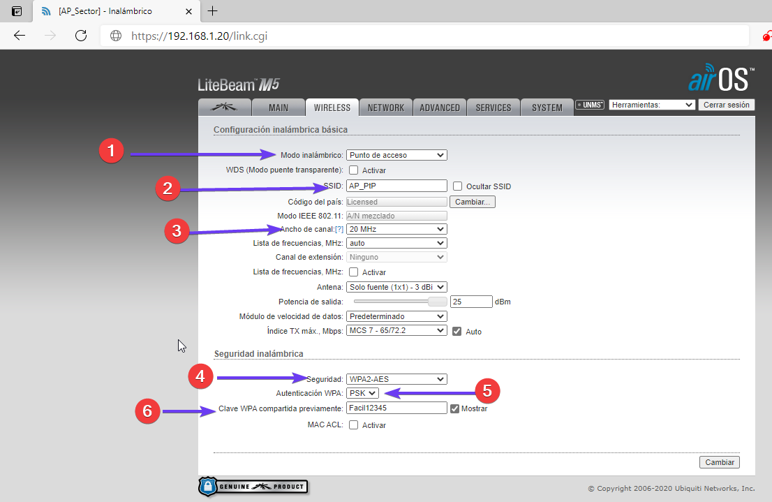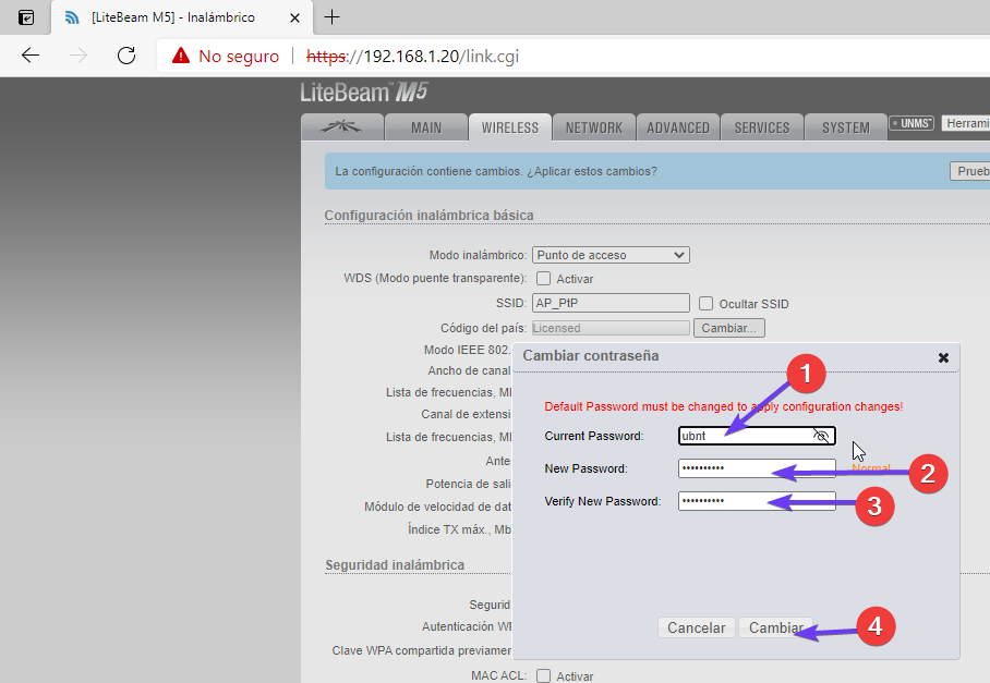 - La contraseña actual es la misma con que iniciamos sesión: “ubnt”