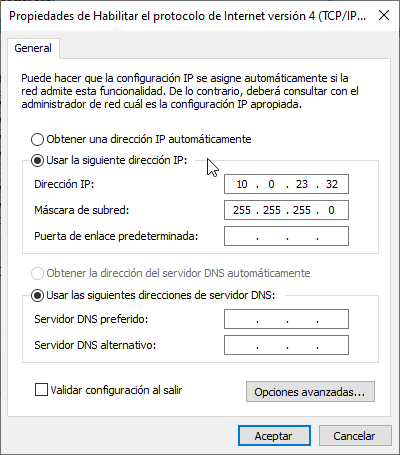 - Gestión de dirección IP: Estática.
