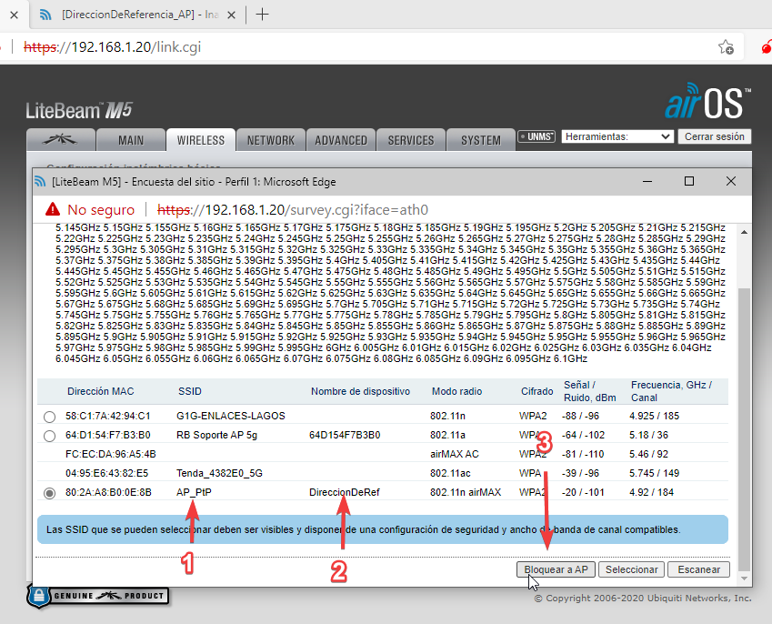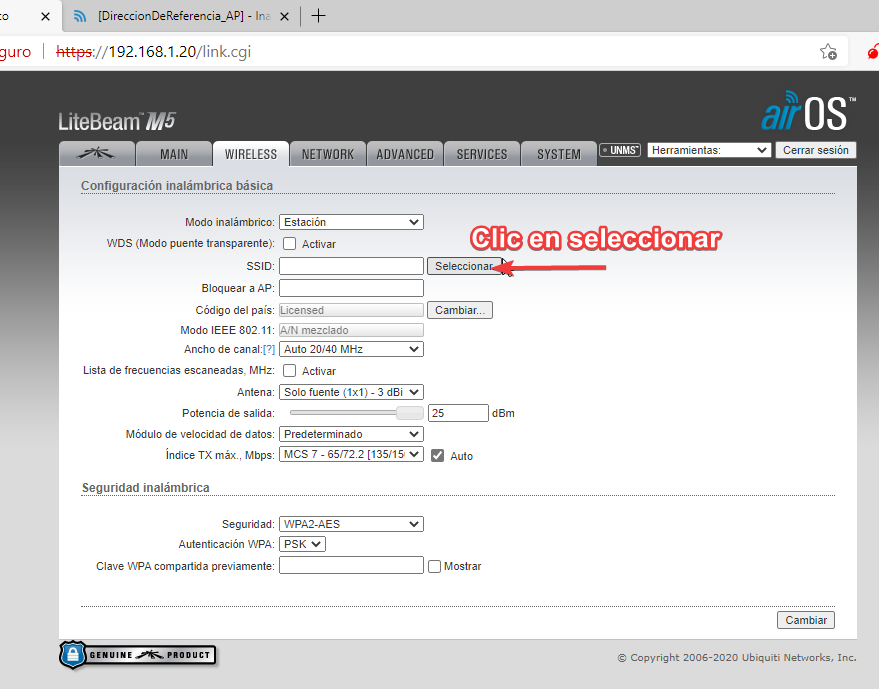 Para acceder al equipo vía web debemos estar en la misma red. La dirección por default de la antena es 192.168.1.20/24. Debemos configurar una dirección IP estática en nuestro equipo que nos permita alcanzar a la antena. No es necesario configurar una puerta de enlace predeterminada.