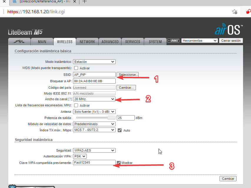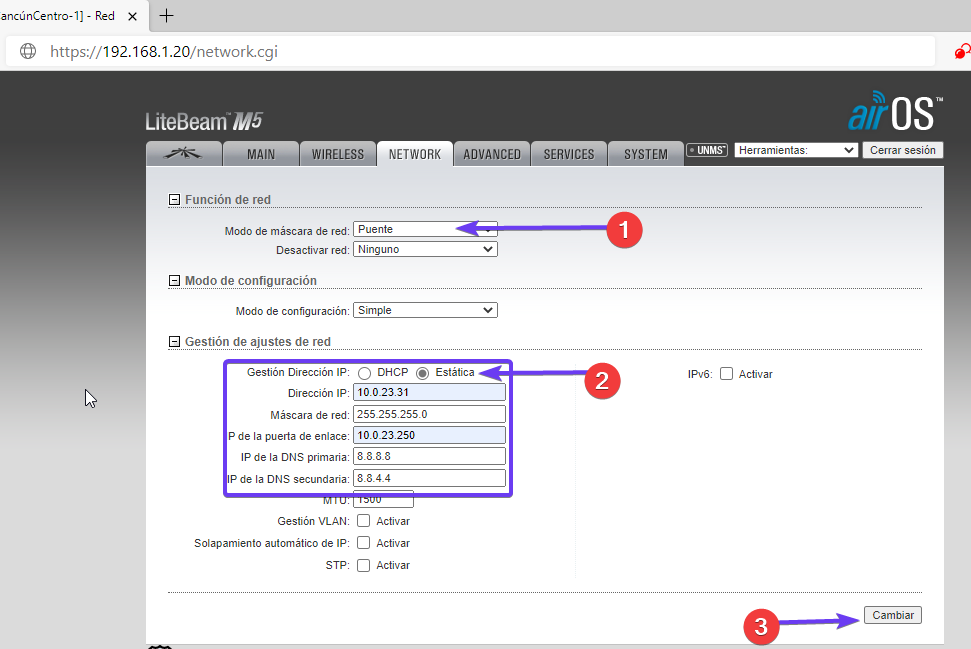 La configuración de Network debe ser consistente con las direcciones que tiene la antena AP.