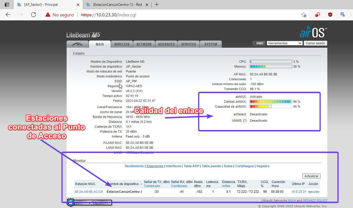Accedemos a equipo Punto de Acceso y verificamos los equipos estaciones conectados, así como la calidad de la conexión que tengamos.