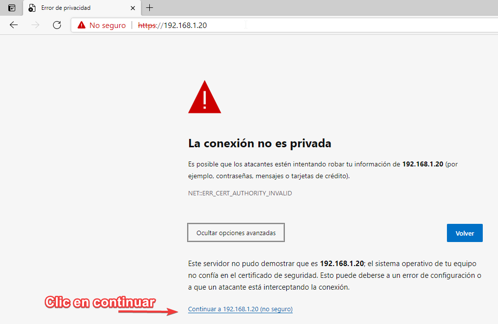 En caso de que al intentar acceder al sitio nos aparezca una advertencia del navegador indicando que el sitio no es seguro simplemente ignoramos la advertencia.