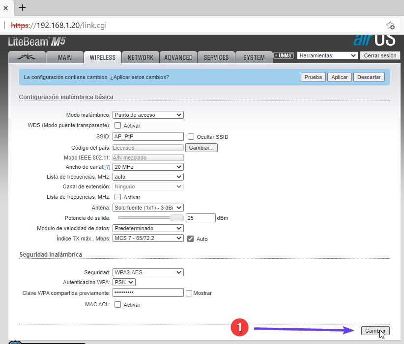 Después de cambiar la contraseña, una vez más es necesario hacer clic en cambiar para guardar los cambios de la configuración Wireless del equipo.