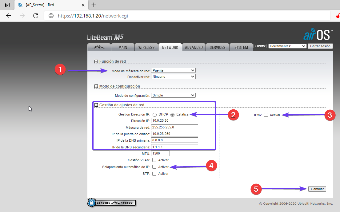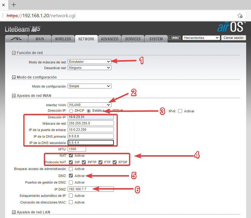 - La puerta de enlace debe ser la interfaz LAN de nuestra antena Ubiquiti à192.168.7.1