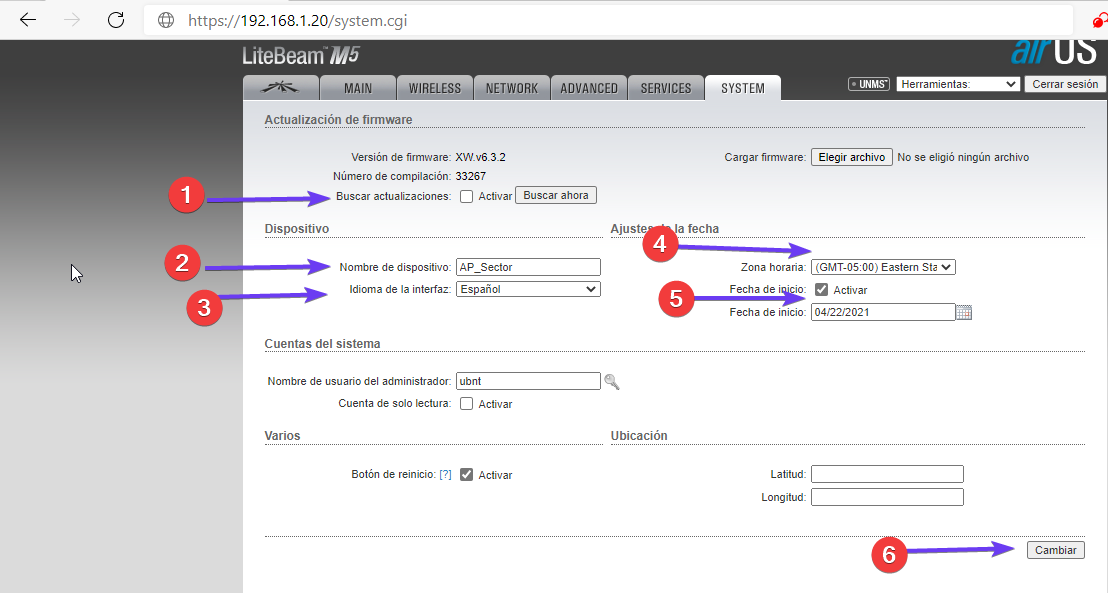 - Fecha de Inicio. Zona Horaria. Habilitar para llevar un registro de la fecha en que se instaló la antena. Seleccionar GTM-5 como zona horaria.